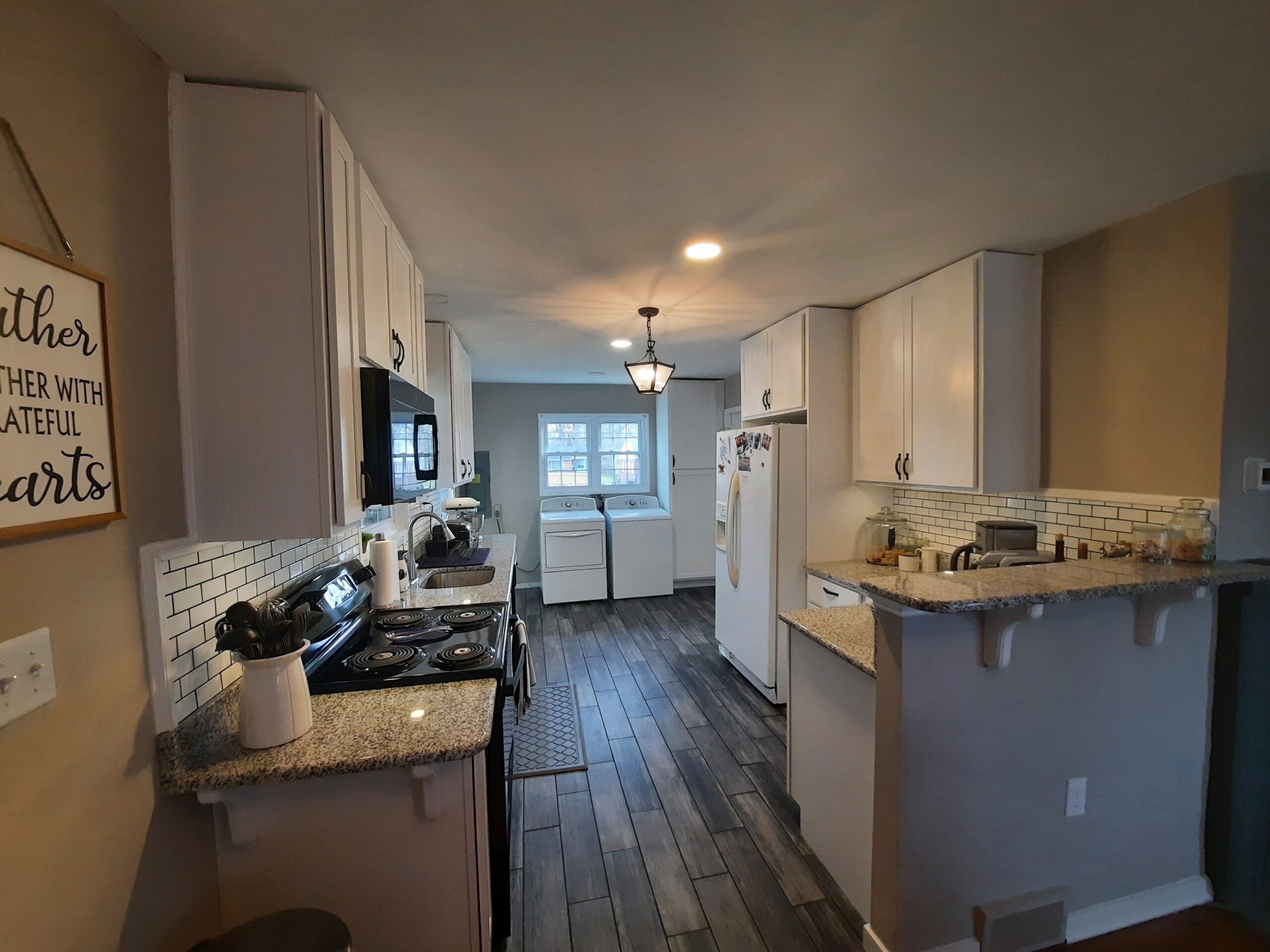 This 16’x10′ open plan kitchen once had two walls to separate the laundry area from the kitchen, and the kitchen from the dining room. Removing the back wall allowed natural light to flood the kitchen. All new cabinets, wood-grained ceramic tiles, granite counters, subway backsplash and fresh paint turned this 19-somethings home into a modern space to enjoy.