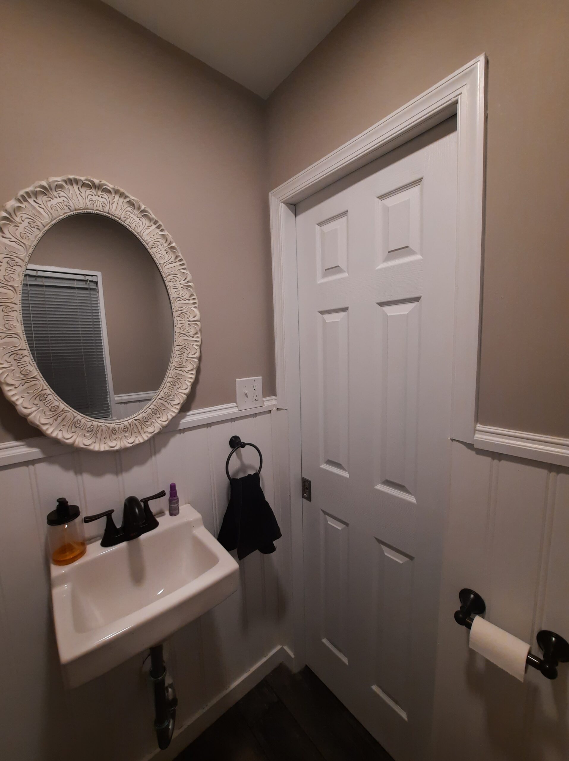This bathroom got an upgrade by replacing the old door with a pocket door, a fresh coat of greige paint from Sherwin Williams, installing 4 foot high Wainscoting, and replacing the hardware with dark polished copper. The classic mirror added the perfect touch to finish off the project.