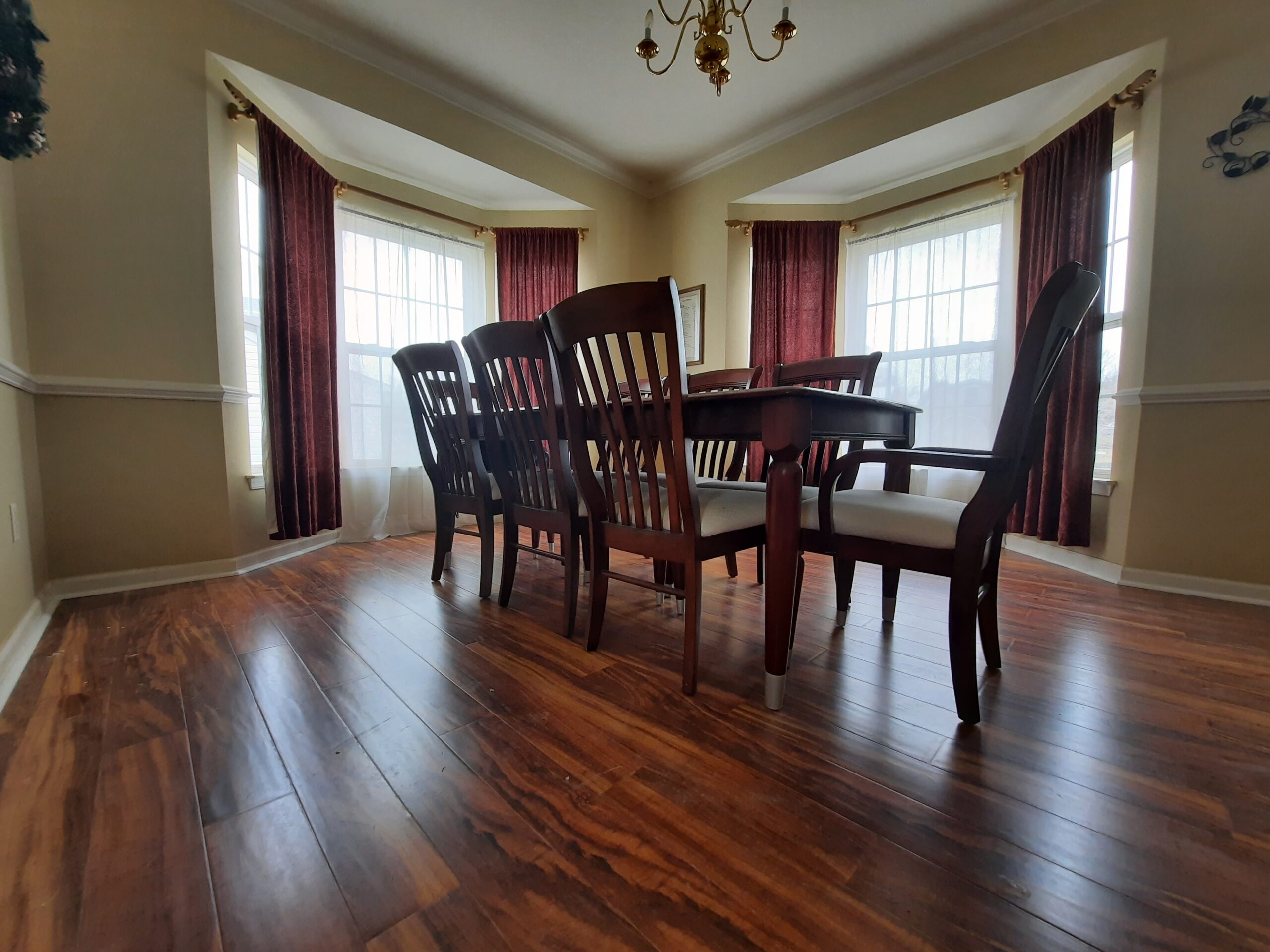 Old carpet and vinyl got replace with beautiful Hawaiian King Koa laminate flooring. The caramel swirls in the floor was able to tie together the colors from entry way (light wood), family room (dark laminate) and kitchen cabinets (natural/neutral wood) cabinets.